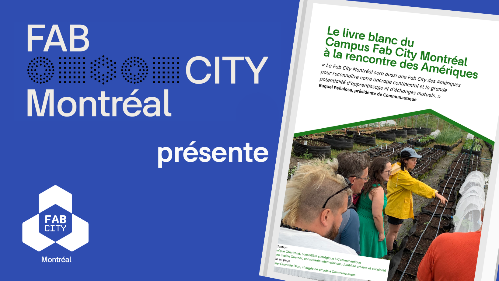 Le Livre blanc issu du Campus Fab City Montréal, à la rencontre des Amériques, est une invitation à poursuivre les collaborations amorcées avec les Fab City des Amériques. Il a entre autres pour objectif de promouvoir la collaboration entre les différents acteurs de la communauté dans le mouvement Fab City pour l’essor d’une approche biorégionale de la transition vers un nouveau modèle productif améliorant les relations de l’humain avec les autres espèces.